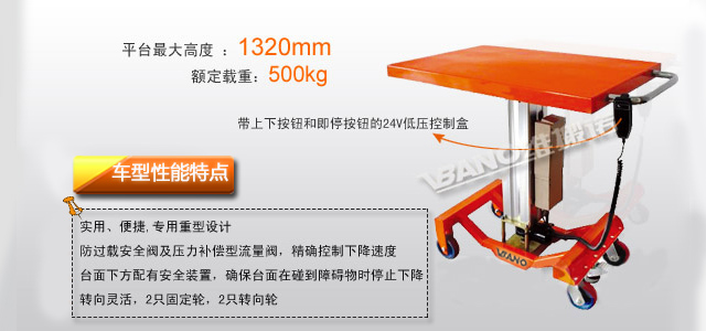 ▲ 實(shí)用、便捷,專用重型設(shè)計(jì) ▲ 防過(guò)載安全閥及壓力補(bǔ)償型流量閥,精確控制下降速度 ▲ 臺(tái)面下方配有安全裝置,確保臺(tái)面在碰到障礙物時(shí)停止下降 ▲ 轉(zhuǎn)向靈活,2只固定輪,2只轉(zhuǎn)向輪 ▲ 帶上下按鈕和即停按鈕的24V低壓控制盒 |