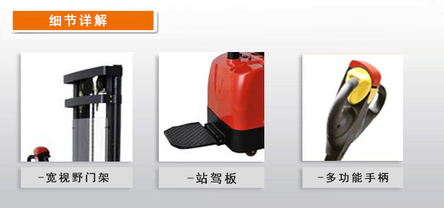 ▲人體工程學手柄,操作舒適。 ▲安全性高的起升電機,大大提升安全性。 ▲站駕式站板有效的提高工作舒適度 | | |