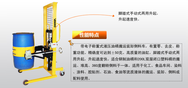 ▲帶電子稱重式液壓油桶搬運(yùn)裝卸倒料車,有置零、去皮、稱重功能。精確度可達(dá)到±50克。高質(zhì)量的油缸,腳踏式手動式兩用升起,升起速度快。適合鋼制油桶和200L雙層閉口塑料桶的搬運(yùn)、堆高、360度翻轉(zhuǎn)倒料于一體。適用于化工。食品車間、染料、涂料、膠貼劑、石油、食油等流質(zhì)液體的搬運(yùn)、裝卸、倒料或配料使用; |
